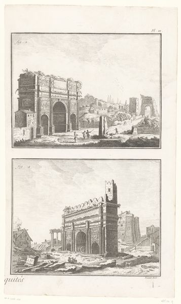 Daniël Marot created this print titled "Twee latwerkgangen" using etching techniques. The image is structured into two distinct scenes, each showcasing elaborate garden architecture. The composition is dominated by archways and latticework, creating a sense of depth and enclosure. Marot’s structured approach to depicting garden architecture reflects the formal garden designs popular during his time. The detailed etching brings attention to the symmetrical arrangements and ornamental features, underscoring a desire to impose order onto nature. Statues are placed to accentuate architectural lines and create a rhythm within the garden spaces. Each archway and section of latticework is carefully delineated, emphasizing its structured, almost mathematical, qualities. The print invites us to consider how landscapes are not just natural but carefully constructed environments, reflecting particular aesthetic and social values. Marot’s emphasis on structure and form encourages viewers to appreciate the underlying order that shapes our experience of designed spaces.