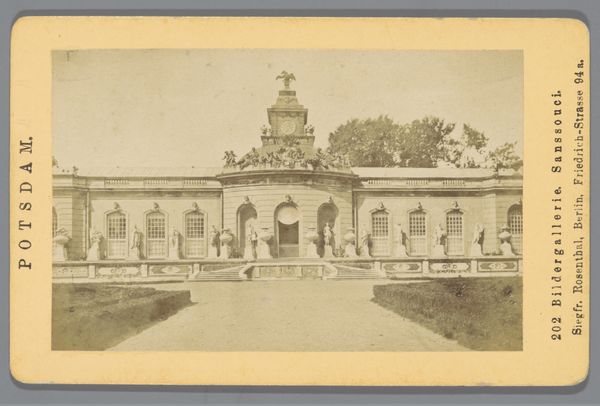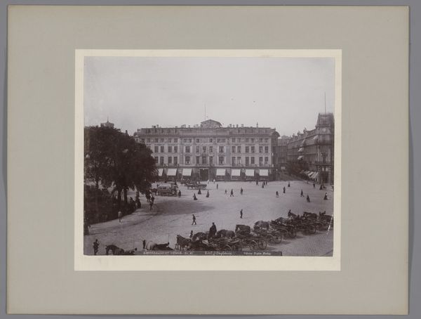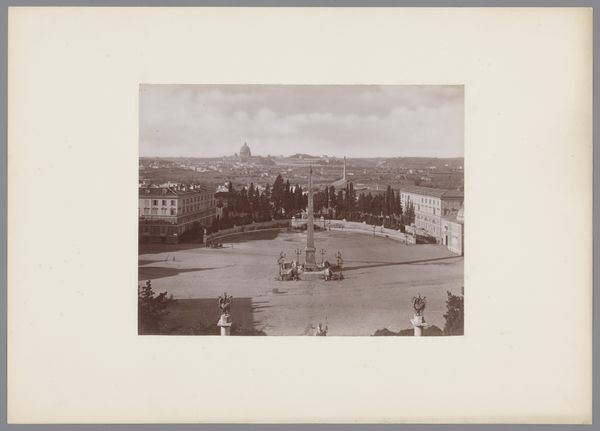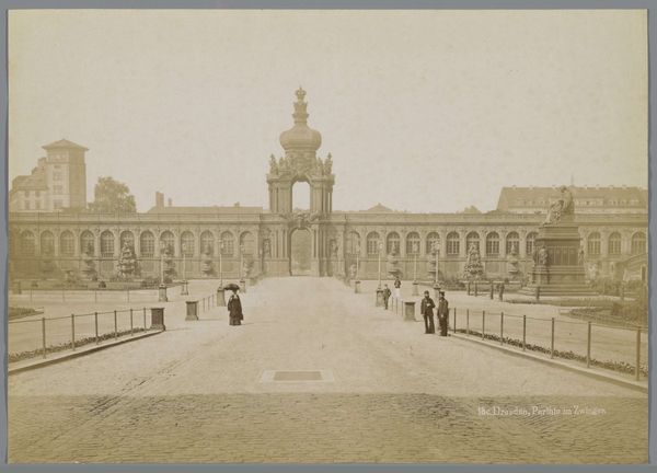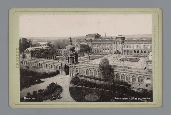 Curator: Ah, Dresden! Take a look at this albumen print from around 1900. The work, entitled "Dresden, Der Zwinger, Totalansicht", gives a birds-eye view of the Zwinger Palace. Stengel & Co. captured this gem, now resting at the Rijksmuseum. What do you make of it? Editor: My first impression is one of tremendous order. Almost...clinical, perhaps. The symmetrical architecture and meticulously designed gardens exude a sense of control and imposed beauty. There’s very little left to chance, wouldn't you agree? Curator: Absolutely. The Neoclassical style practically screams for symmetry. But beyond that controlled facade, don’t you sense a story yearning to break free? Those archways—I imagine laughter echoing through them. Or whispered secrets among courting couples as they wander those geometrically pleasing gardens. It is a moment perfectly captured! Editor: Certainly. I appreciate how the photographic print accentuates the palace's linear forms, creating this sense of depth. The varying tones articulate the architectural features effectively; you know, drawing the eye to focal points and highlighting that meticulous play of light and shadow across the surfaces. Curator: And the details... You see that little flourish of landscaping just beneath the main buildings? The careful composition draws the viewer's eye across the vast plane of architectural precision, finding humanity in tiny, meticulously plotted floral explosions. For a second, my mind is pulled from the concrete, brick, and stone. The image itself pulls me in; this isn’t just history, it is home! Editor: Very insightful, the use of light really emphasizes that feeling you mention. Ultimately, for me, it’s how this print embodies those formal Neoclassical values, translated into photographic form. That commitment to symmetry, balance, and proportion, it makes it stand out. Curator: Well said! "Dresden, Der Zwinger, Totalansicht” captures a moment frozen in time; now, for you and I to explore! Editor: Indeed. A lovely testament to enduring aesthetic ideals.