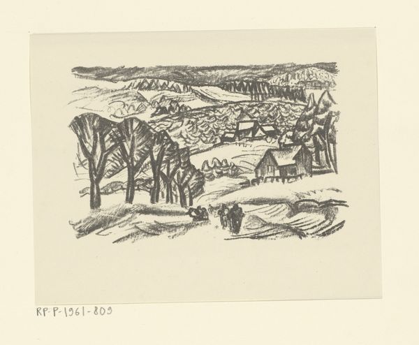 Editor: This is Lucien Pissarro’s wood engraving, "Landscape: Blackpool, Devon," and I am fascinated by the intricate linework and tonal contrasts. What do you see in this piece? Curator: The composition is structured around the interplay of positive and negative space. Notice the density of the hatched lines creating dark masses versus the stark white areas, shaping our perception of form and depth. How does the artist's choice of a limited palette influence your interpretation? Editor: I see what you mean. The stark contrast emphasizes the geometry of the landscape. I hadn't considered how the limited palette contributes to that effect. Curator: Precisely. The reduction to essential forms—lines, shapes, tones—reveals the underlying structure of the scene, inviting contemplation on the nature of representation itself.