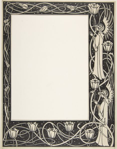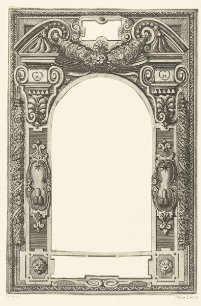 Curator: Here we have "Omlijsting bestaande uit twee verticale panelen en twee friezen," which roughly translates to "Frame consisting of two vertical panels and two friezes." Created between 1646 and 1657 by an anonymous artist, this work resides here in the Rijksmuseum. Editor: It strikes me as quite somber for something intended as a frame. The monochrome palette and dense, intricate detailing almost overwhelm the central space, creating a kind of visual tension. Curator: Yes, these types of decorative borders were hugely popular in the Northern Renaissance. Let’s consider the social function: Prints like this would have been used by artists and artisans to decorate all types of things. You’d paste it into a book, or perhaps use it to inspire decoration on furniture. Editor: Interesting. To me, the border's details are laden with symbols. There are figures enclosed in little architectural niches, flora and fauna – I wonder, are they purely decorative or carrying some hidden meaning? The male figure versus the female figure in a lamp. Are these a symbolic representation of a period ideal about gendered spaces and how people should behave in society? Curator: Likely a combination of both! While individual symbols can have inherent meanings, their deployment is always historically and socially dependent. In a print circulated widely, what messages were these conveying? Editor: The basket of what seems to be overabundant squash at the base hints at ideas about fertility and wealth. But what’s most interesting is thinking about what was supposed to occupy the center. Was it used to frame a biblical quote, a drawing, an announcement of sorts? What does it mean for us to now find the frame without its intended context? Curator: That absence reframes it, doesn’t it? Now we can appreciate it purely as an object that once held power as a marker of taste and status. It brings the question of institutional taste too – the politics of collecting what others discarded or undervalued. Editor: Absolutely. We’re left to grapple with the historical context but also our current gaze. These historical pieces encourage modern discussions around historical gender roles. We can consider what social norms are embedded, literally etched, in these seemingly ornamental things. Curator: Right, it asks us to see these kinds of works not just as decorative items, but artifacts deeply embedded within their time, shaped by forces that reach far beyond simple aesthetics. Editor: Precisely. Examining this engraving lets us delve deeper into the interconnectedness of art, history, and identity, unveiling subtle yet significant perspectives.