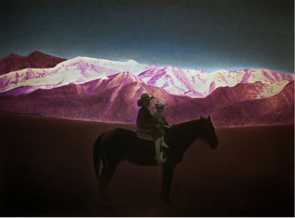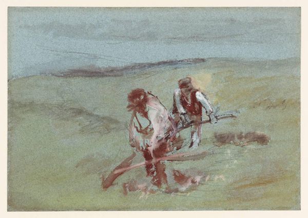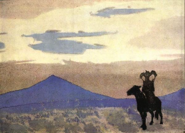 Editor: Here we have Nicholas Roerich’s watercolor, “Lonely Stranger,” from 1931. The vast sky and hazy mountains evoke a sense of solitude. How does this image speak to its historical context? Curator: It's fascinating how Roerich blends Romanticism with Orientalism. The "lonely stranger," a figure on a camel, appears against this grand landscape. Roerich was deeply interested in Eastern spirituality, and travelled extensively in Central Asia, and he helped to establish the Roerich Museum in New York to foster connections with Asian cultures. How do you think his work engaged with or challenged Western perceptions of the "Orient" at that time? Editor: It seems to me it perpetuates some of those romantic ideas, doesn't it? The solitary figure in a seemingly timeless landscape… it's all very "exotic," in a way that maybe flattens the diversity of those cultures. Curator: Precisely! And his emphasis on spirituality must be viewed in light of rising cultural institutions such as museums that were responsible for disseminating particular world views to mass audiences. Were these kinds of works promoting genuine cross-cultural understanding, or more a Western fantasy imposed on another culture? Editor: That makes me reconsider my initial impression. It is not just a peaceful image of solitude. I realize that Roerich’s view, mediated through art, contributes to complex and ongoing debates about cultural appropriation. Curator: Yes, this watercolor serves as a reminder of the complexities inherent in cross-cultural representation and artistic license. By understanding these sociopolitical currents, the work provides valuable historical lessons.