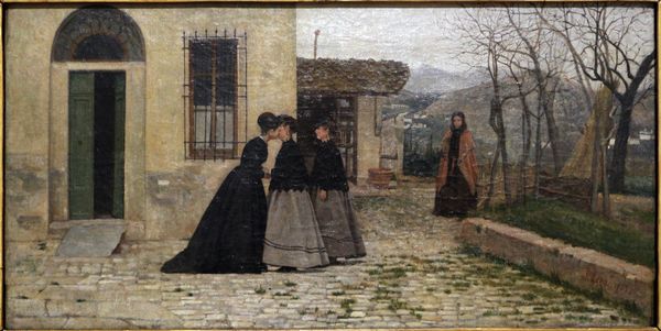 Editor: This oil painting, titled "Mourning, Brittany" by Charles Cottet, is quite striking. The somber mood is palpable, accentuated by the figures cloaked in black against the muted landscape. What do you see in this piece? Curator: These figures, their faces framed by the stark black cloth, evoke a profound sense of collective grief. The black isn't merely a color; it’s a potent symbol, a uniform of sorrow dictating that each woman will share the burden, their identities almost merging in this shared experience. It is cultural memory, wouldn't you agree? Editor: I do see that now. The black robes create a feeling of unity. Tell me more? Curator: Observe how their positioning within the landscape creates a powerful contrast. The dark figures are juxtaposed against the background, with houses as cold silent witnesses and bodies of water and fields providing for solemn continuity. What feelings arise when you look at the ocean so still, with sails far away and faint on the horizon? Editor: Melancholy comes to mind, also stillness, quiet reflection... Perhaps acceptance? I initially missed the emotional undercurrents woven into the scene. It really emphasizes the women's emotional states and, by extension, invites empathy from the viewer. Curator: Cottet uses symbolic form, an image which reveals not only surface appearance but resonates as an eternal form: a moment transformed into an icon that can transcend the event itself, prompting us to explore our cultural understanding of mourning, and maybe also explore the psychological weight that comes with facing life’s hardest moments together. Editor: I learned a lot! Thank you. Curator: Me too, looking at it with fresh eyes helps highlight the nuances.