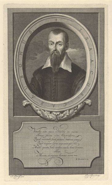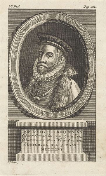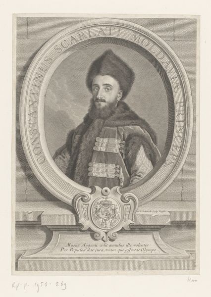 Editor: This is Georg Friedrich Schmidt's engraving, "Constantine Moldavi, Prince of Scarlati." I’m struck by the ornate details and the overall impression of formality. What do you make of this portrait? Curator: It's like peering into another world, isn't it? I'm drawn to the symbolic weight of the garments, the fur hat, and the regal presentation. I wonder, what kind of message does this carefully constructed image send about power, status, and identity during that era? Editor: It’s interesting to think about how much an image like this would have communicated. Curator: Precisely! And for me, the power of such portraits lies in what they leave unsaid, inviting us to imagine the life, ambitions, and even vulnerabilities, of Prince Constantine Moldavi.
