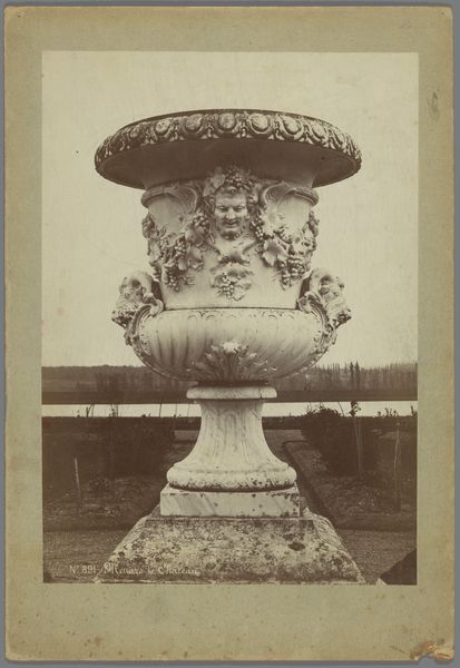 Curator: Here we have an interesting photograph by Adolphe Giraudon dating from around 1875 to 1900. It's titled "Afgietsel van een kapiteel in de Kathedraal van Laon," depicting a cast of a capital from Laon Cathedral. Editor: My first thought is, "grand." It's stark and incredibly detailed; the heavy shadows give the carving a real sense of depth, despite it being a photographic reproduction. Curator: Exactly! Giraudon's photography played a key role in disseminating Romanesque architectural details. This photograph served as a vital record and educational tool during a period of intense architectural restoration and study across Europe. The Laon Cathedral, an early Gothic masterpiece, was a subject of great interest. Editor: So it's a copy of a copy, in a way? I wonder about the politics of reproduction at the time. Access to these cultural treasures was increasingly democratized through photography, but it also reinforces a certain colonial gaze, doesn't it? What stories are left untold, or unseen in this capture? Curator: It's a fair point. The accessibility afforded by photographs allowed wider audiences to appreciate and study these works, influencing architectural styles and preservation efforts. But it also enabled a detached, objectified view. Editor: It feels like the start of mass media applied to cultural heritage. Look at the stylized leaves. You can almost feel the weight of the stone, the precision required to carve such intricate details. It must have taken teams of skilled artisans to complete the original capitals. Curator: Yes, and photographs like this highlighted the skill of the original artisans and sparked discussions about craftsmanship in the age of industrialization. This image documented not just the aesthetic, but also served as a template that later inspired other architectural embellishments of buildings. Editor: I appreciate the tension. The desire to document, study, and emulate such an important art style versus the questions it poses regarding power and accessibility to the very notion of ‘culture.’ Curator: Precisely. This seemingly simple photograph encapsulates a complex moment in the history of art, technology, and cultural dissemination. Editor: It makes you consider whose stories and perspectives are valued—and how different visual formats influence public narratives.