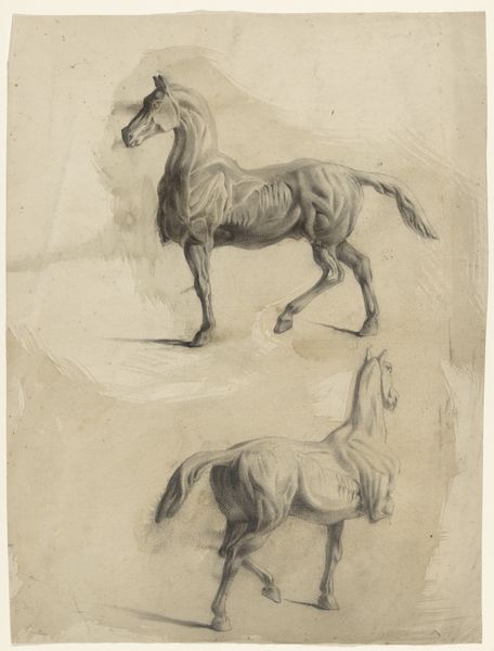 Curator: Immediately I'm struck by how dynamically unsettling these figures appear! There's an urgent sense of movement—or maybe resistance—in the depiction of these riders and their horses. Editor: The print you are observing is entitled "Study of Young Horsemen, pl. XV from "Recueil de caricatures"," made by Ange-Laurent de La Live de Jully between 1749 and 1759. Executed through etching, the artist captures, well, precisely that – a study. A commentary emerges here that reveals so much more than horsemanship alone, one layered within sociopolitical tensions. Curator: Ah, a "Recueil de caricatures!" So this isn't just about equestrian skill, it’s offering some sort of social commentary then? The rider on top, draped dramatically, is posed versus the seemingly disheveled lower rider— is class at play? The upper rider carries a clear and self-possessed air versus the tension of the rider underneath him. Editor: Precisely! Think about the Baroque period in the context of societal structures, about who had access to equestrian training and the leisure that it symbolized. Now contrast the refined posture of the rider above with the lower figure struggling to control his mount. We could ask how issues of social mobility and power dynamics find expression here? Is it a critique of aristocratic affectation? A parody of ambition? Curator: I like how the stark, almost clinical style of the etching accentuates the caricature too. The bare background throws these figures into sharp relief. No romantic scenery to distract us from the characters. The horse and rider combination, the way they present together to an external world; are these individuals projecting confidence or trying to grasp power through association? How does the artist want us to interpret this? Editor: Consider how the *act* of caricature serves as a subversive act, too. These "studies" perhaps capture truths, revealing a fragility, a pretense, even if unintended, beneath a carefully constructed social performance. The elite are forced to confront less curated, more vulnerable versions of themselves, impacting both their social and personal perception. What stories are behind the social masks? Curator: The tension between performance and reality really resonates. We are drawn to interpret beyond the surface, looking at the individual experience beyond outward appearance. I appreciate how it pushes us to confront what remains concealed underneath! Editor: It is a sharp reminder to examine power not as a static entity, but rather something continuously negotiated, performed, and, sometimes, undermined through satire.