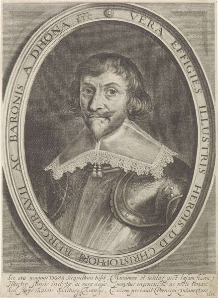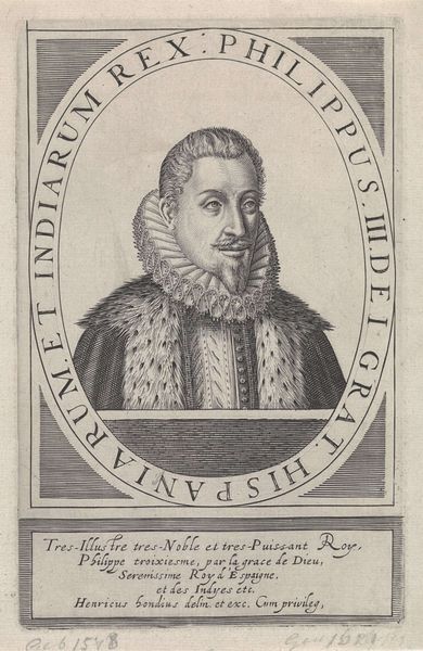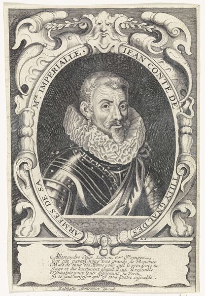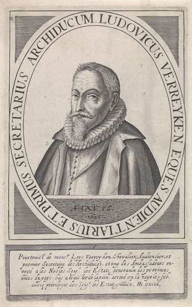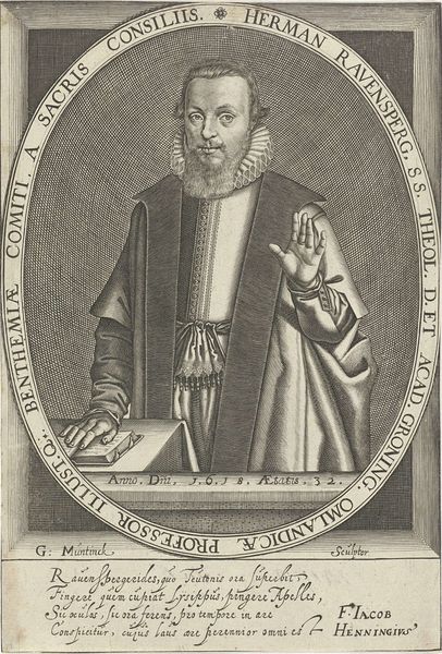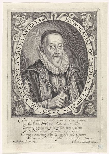 This is Theodor de Bry’s "Portret van Richard Stock", an engraving from the late 16th century, now housed in the Rijksmuseum. The portrait is encased in a decorative border, the lettering and ornamental flourishes framing Richard Stock’s solemn face. De Bry masterfully uses line and texture to create depth and character, look at the intricate details of Stock's beard, the ruff around his neck, and the heavy fabric of his robe. The structural elements of the composition work to convey a sense of dignity and intellectual rigor. Note how the geometric shapes of the border contrast with the organic forms of the foliage and script, creating a visual tension. The formal construction of the portrait, with its emphasis on symmetry and balance, reflects the values of the time. The engraving uses semiotic systems to communicate Stock's status and identity. It offers a complex interplay of form and content, inviting us to consider the cultural codes embedded within its lines and shapes.