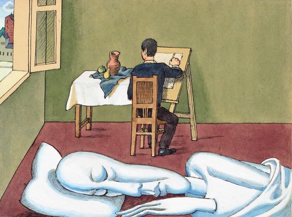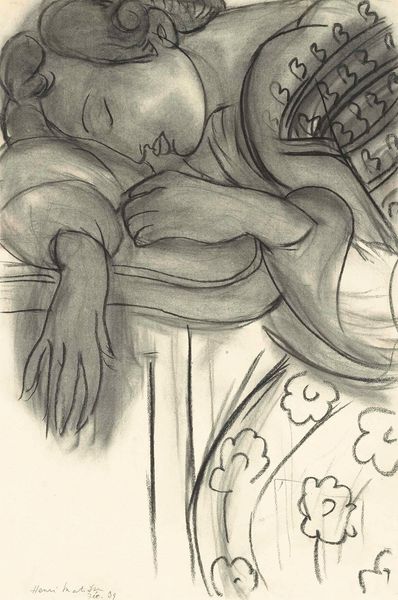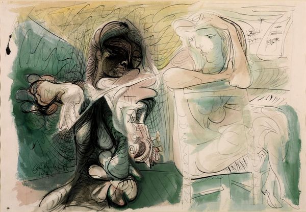 Curator: We are looking at Pablo Picasso’s "Women's Toilette" from 1961. Painted in his distinct cubist style, it portrays a woman in a somewhat unconventional seated pose. Editor: It strikes me immediately with a rawness. The colors, primarily earthy browns and muted grays, create a sense of quiet melancholy, a stark intimacy. You can practically feel the coarse texture of the paint he’s using. Curator: Absolutely, and this was painted relatively late in his career, when he was very established. What’s interesting is seeing Picasso still push against conventional ideas about femininity and representation, at a time when popular imagery of women was being very carefully shaped through film and magazines. Editor: The visible brushstrokes emphasize the materiality. It's not striving for photorealism but declaring itself as paint, as labor. Look at the construction of the figure - it seems less about objectifying a woman, and more about his actual experience grappling with a physical representation. It's about the activity and labor of painting, not about a subject, and by that activity subverting expectations for figurative nude painting.. Curator: True. In many ways the angular forms and flattened perspective invite the viewer to actively reconstruct the image, challenging traditional ideas about looking and the male gaze in art. Editor: Consider the social context too. We're on the cusp of a second-wave feminism, when these conventional ways of depicting and representing women are being publicly challenged and questioned for the first time, at scale, making his subversion here extra powerful. Curator: It’s as though, even within a seemingly domestic and private setting, he’s critiquing those larger public constructions of womanhood. Editor: It’s about pushing and pulling, and even breaking the conventions in both life and the artwork materials. This piece, with its almost defiant approach, demands a reevaluation of how we look and consume art itself. Curator: It leaves you wondering how much agency he was affording his subjects, even as he seemed to challenge artistic traditions in the cultural milieu that produced his artwork. Editor: Indeed, it’s a piece that makes us consider our own role in looking, the materiality, and the societal weight it carries.