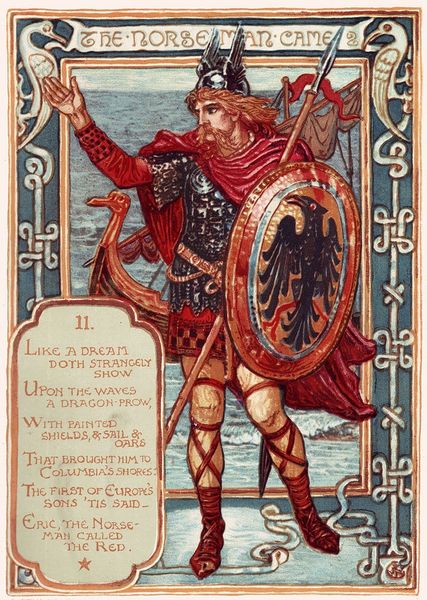 Walter Crane created this illustration, Columbus, which employs a vibrant palette and strong compositional structure to elevate the image to that of iconic status. Notice how the composition, enclosed within an ornate frame, uses symbolic elements arranged in a vertical hierarchy, from the globe above to the anchor and mythical sea serpent below. The central figure of Columbus directs our gaze upward and outward. He is standing on the steps from the ship, caught between the Old World he is leaving and the New World he hopes to find. The poem reinforces this sense of anticipation and historical drama. Crane, influenced by the Arts and Crafts movement, brings together aesthetic beauty with cultural and philosophical ideas. He challenges us to decode historical narratives and the complex interplay between text and image. The artist employs visual signs and invites us to re-evaluate our understanding of history.