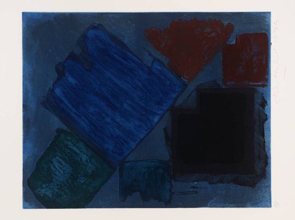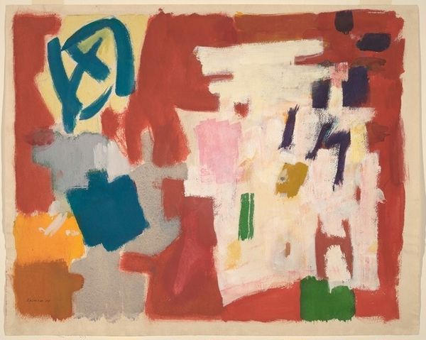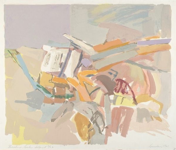 Curator: Welcome. Before us hangs "Scheherazade," a pastel and dry-media drawing crafted by Jacob Kainen in 1986. What's your initial reaction? Editor: It feels...untamed. Like a garden overgrown with memory, a coded narrative trying to push through blocks of color and scrawled lines. Slightly unsettling but deeply intriguing. Curator: I see what you mean. Kainen’s approach is far from mimetic. The work resists a singular reading, leaning into an abstract-expressionist idiom, marked by distinct geometric forms and swathes of pigment. Notice the border almost containing the controlled chaos. Editor: The interplay between containment and expression, you mean? Absolutely. There's this tension that pulls me in, these almost clumsy shapes. That muted green square paired with those hesitant red dashes…it feels intentionally dissonant, a composition fighting itself. Curator: Indeed. It might even evoke semiotic discourse, for how can viewers extrapolate some latent content? It’s difficult, as the artist rejects that very principle, but what if these colours are letters or icons of some grand, forgotten fairytale? Editor: Right, "Scheherazade." Like the legendary storyteller spinning yarns to postpone her doom, maybe Kainen is using abstraction to evade, to suggest rather than state? And isn't it curious that despite the overt abstraction, those sweeping, almost calligraphic lines suggest figures or paths? Curator: It brings me back to the medium. Consider the deliberate softness of the pastel versus those raw lines, likely applied with something else, and their effect. Kainen achieves a striking equilibrium, pushing boundaries through simplicity. Editor: Exactly. So, "Scheherazade" becomes this tapestry woven from the refusal to cohere— a story told through erasure. The absence of direct representation becomes the artwork's narrative strength, an invitation to project. Curator: That's the joy, isn't it? The work presents no easy answers, it is not dogmatic and is evocative because it makes the observer fill in the blanks with the power of pure intuition. Editor: Beautifully put. I’ll be mulling over those "blanks" for quite a while, I suspect.