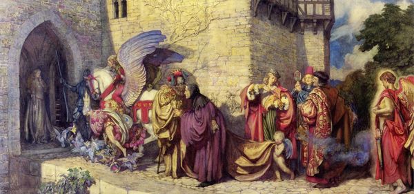 Editor: Here we have Jean Hey's "Meeting at the Golden Gate," painted around 1488. The oil paint gives it a beautiful texture, and it strikes me as quite theatrical with its careful composition. What jumps out at you? Curator: Primarily, the arrangement of the figures—their precise placement—dictates the viewing experience. Notice the spatial relationship established through their staggered positioning and varying scales. How do the figures interact spatially? Editor: Well, the embracing couple dominates the left side, while the king stands rigidly on the right, seemingly isolated despite his grandeur. Curator: Precisely. The figures exist within clearly defined planes and shapes and this creates visual interest. What about the relationship of light and shadow to convey meaning? Editor: I see, the figures are lit so sharply which causes the colors to stand out more distinctly against one another. The contrast emphasizes their individual presence. Curator: Consider also how Hey uses symmetry and asymmetry. The doorway acts as a dividing line and establishes an unbalanced composition; can this reveal anything about the theme? Editor: It's as if Hey is contrasting themes: the intimacy of the couple against the King’s isolation. I hadn’t considered that. Curator: Indeed. Reflect upon how each element, from the architectural backdrop to the drapery folds, functions to create the artwork's symbolic impact. Every element contributes to the overall impact. Editor: Thanks. Focusing on these pictorial aspects makes the image incredibly engaging, even beyond the historical context.