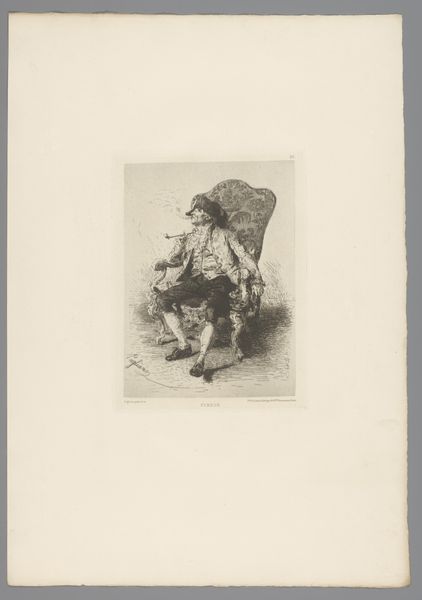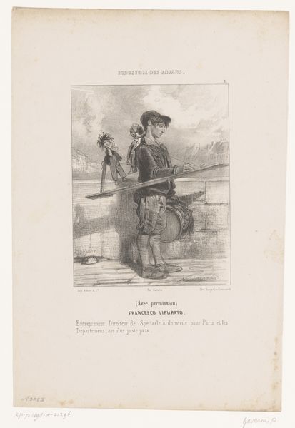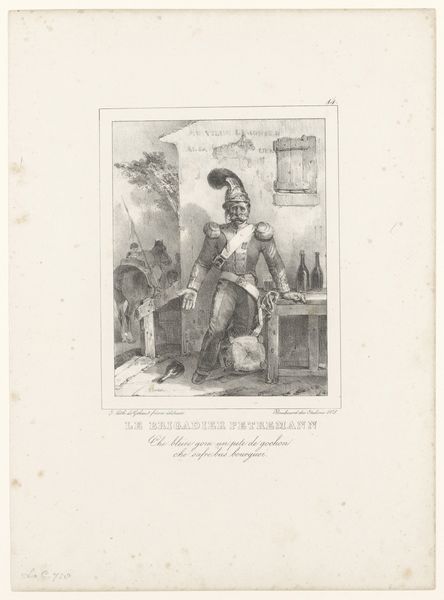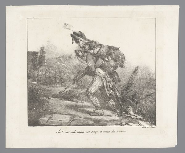 Curator: This etching, made around 1831, is titled "Leopold I van België steekt de grens over, 1831," and is, of course, held at the Rijksmuseum. It's a fascinating example of period caricature, offering sharp commentary on a pivotal historical moment. Editor: The figure's bowed posture and the weighty sacks... they really speak to a sense of burden and perhaps reluctant acceptance of responsibility. Curator: Exactly! The piece employs engraving and etching, both traditional printmaking methods that allowed for mass production and dissemination of political ideas. Note how the text at the bottom reads, "Dernier Protocole en Chair et en Os"—"The Last Protocol in Flesh and Bone." Leopold, quite literally, bears the "protocols" on his back. Editor: This speaks volumes about the conditions of artistic production and reception at that time. Print media allowed political critique to spread far beyond elite circles. Considering that Belgian independence was so recently declared, images like this helped shape public opinion. What materials were readily accessible? Whose messages were amplified? The lines are sharply defined—revealing, almost brutally so, what labor and consumption was taking place. Curator: The political landscape truly comes alive when we analyze visual rhetoric within broader socio-political structures. Who commissioned this, and for what specific audience? Editor: Indeed. And if you examine the engraving, we must ask: were cheaper inks used to produce it on a mass scale? This kind of thing really impacted access and use. Curator: These prints offer essential clues about how emerging nations use images to construct a shared identity, even one based on shared anxieties about governance. Leopold becomes a figure saddled with the bureaucratic weight of his new nation. Editor: Absolutely, and considering the physical labor involved in etching—the hours of meticulous carving—it emphasizes a contrast between elite decision-making and the realities of those who must enact policy. What did it take to disseminate such materials, literally? Curator: A fantastic question! The way those production processes ultimately shaped how the broader public engages with state power. Editor: Thinking about these layers gives us more insight into how society, art and power intersect in critical ways.