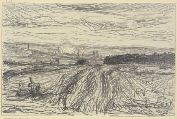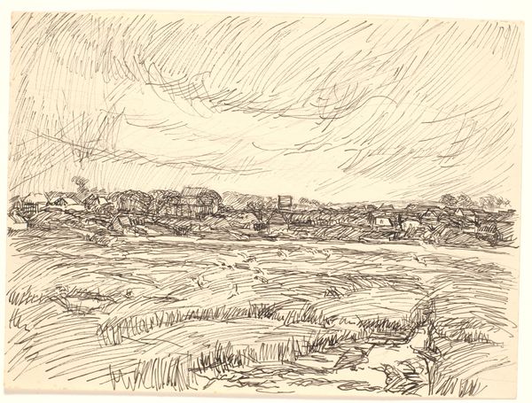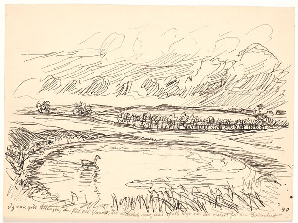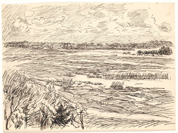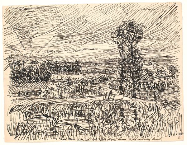Curator: "Landskab med marker," or "Landscape with Fields," done in 1928 by Fritz Syberg, gives us a glimpse into the Danish countryside using primarily pen and ink. What’s your first impression? Editor: I'm immediately struck by its unsettled quality. It's not your typical pastoral scene; there's a sense of almost frenetic energy in the lines, particularly in the sky. Curator: Absolutely! It’s like the pen itself is mimicking the wind. You feel like you’re right there, about to be swept away by it. The use of line is fascinating, isn't it? Look at how Syberg uses hatching to create depth in the fields, yet everything retains this light, airy quality. It’s a dance between precision and looseness. Editor: That interplay speaks volumes. Consider the period – 1928, just before the Depression. This frantic linework might reflect the underlying anxiety and uncertainty of the era, especially regarding land and livelihood. Were these fields fruitful? Were the farmers prospering, or struggling against forces beyond their control? Curator: That’s a compelling reading. I think about Syberg’s own life; his struggles with mental health, the intensity he poured into his work. Maybe it's not just the land itself but a projection of inner turmoil. The landscape becoming a mirror for the artist’s emotional state. Editor: Yes! And landscapes have historically served as powerful markers of identity and ownership. Whose land is this? Who benefits from its yield? Syberg might be subtly questioning these power dynamics through the seemingly simple act of sketching a field. The absence of people further emphasizes the raw, almost violated, feeling of the earth. Curator: Violated, in what sense? Editor: Exploited, perhaps. Think about agricultural practices, land ownership concentrated in the hands of a few. Even without explicit figures, the drawing subtly evokes themes of labor and social inequality tied to the land. Curator: It's funny how a seemingly straightforward sketch can open up into such layered interpretations. It's a testament to art's ability to hold so many meanings simultaneously. Editor: Indeed. Syberg gives us a glimpse of a place and moment, but the ink bleeds beyond the literal. We're left pondering not just what we see, but what it suggests about the human relationship to the earth.