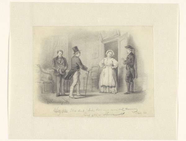 Curator: Herman Frederik Carel ten Kate, around 1847 to 1863, created "Three Figures in an 18th-Century Interior." It’s an engraving on paper, currently held at the Rijksmuseum. Editor: My initial response is of constrained relationships. Despite the elaborate interior, there is a noticeable formality between the figures. Curator: The engraving illustrates a domestic scene, reflecting the artist's interest in genre and historical painting. Examining it through a feminist lens, it prompts questions about the power dynamics represented here, right? Editor: Absolutely. The iconography supports that reading. The elder woman, centrally placed, dominates the seated younger woman, while the man stands, perhaps ready to depart, a symbol of patriarchal authority entering or exiting their space. Curator: I agree. Ten Kate positions them within this very constructed space, emphasizing their roles. Notice the man’s exaggerated gesture, almost like a performer displaying himself before an audience of women whose futures likely depend on this encounter. Editor: And consider the objects within the room, carefully rendered – the floral arrangement, the ornamental table, they amplify the mood, subtly signaling decorum and perhaps a latent desire for beauty and order amid unspoken tensions. Curator: The scene hints at negotiation or expectation, but for whom are these conventions performed, and at what cost, especially considering the limited agency historically afforded to women of this class? Editor: It makes me reflect on how interior spaces become stages for societal expectations. How we adorn them and move within them reflect broader cultural narratives of that time, persisting still today. The symbolism inherent here remains relevant to understanding our present reality. Curator: This close reading certainly provides insights. Understanding not only how such scenes reflect but also shape historical and contemporary understanding of gender and class structures. Editor: Agreed. This print acts as a lens, reminding us to question the images we see and the messages they perpetuate, and also the historical burdens visual languages carry within societies over time.