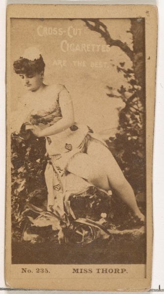 Curator: This is a fascinating piece. It's a trade card dating from 1885 to 1891, created by Allen & Ginter for Virginia Brights Cigarettes. It’s part of a series called “Actors and Actresses” and this one features Miss Urquhart. The medium appears to be photography printed as a card. Editor: Interesting... The composition is immediately striking. The off-center placement of Miss Urquhart against what appears to be a natural backdrop—very carefully staged, though, I suspect. There's a visual tension created by the asymmetry that draws the eye. The sepia tone also lends a melancholic quality, even romantic, dare I say. Curator: Absolutely. These cards were immensely popular at the time. The burgeoning consumer culture found ways to integrate art and advertising and shape celebrity. This image of Miss Urquhart and others circulated widely. This wasn't just about selling cigarettes; it was about associating a product with beauty, fame, and aspirations. Editor: And that sepia tone becomes even more powerful. Note how it unifies the whole image! The light delicately renders texture - her hair, the details on her gown, the rough bark of that stage-managed tree, the details in foliage behind her – almost painterly in effect. It creates a visual harmony, and her somewhat shy downcast gaze emphasizes that harmony between artifice and the natural world in her pose. Curator: Yes, there's a curated "naturalness" at play here. Miss Urquhart's gaze directed downwards, perhaps reading? It presents an intriguing paradox given the overt commercialism, and hints to her perceived public role at the time, while drawing you, the consumer, into a quiet intimacy. The company aimed for sophisticated marketing and appealed to a class of emerging patrons. Editor: Quite right! Her pose suggests classical statuary while the details in the dress also reflect patterns found in arts and crafts design. By including those specific design details, you create a modern feel to it while elevating the design beyond the simple commercial appeal. Curator: Examining how such imagery played a role in constructing identities is interesting as these images acted as artifacts reflecting evolving social dynamics. This unassuming card tells us about the intersection of entertainment, commerce, and the public's fascination with fame. Editor: Ultimately, a piece like this reveals that even the smallest of artistic fragments have meaning. By examining how the artist uses basic structural components, we come to see what society finds visually appealing.