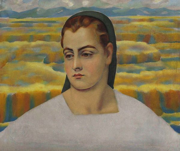 Editor: Here we have Kuzma Petrov-Vodkin's "Portrait of M.F. Petrova-Vodkina" from 1913, crafted with oil paint. It has a lovely softness, a gentle kind of melancholy, maybe? What can you tell me about this work? Curator: Look closely at the materiality of the painting. Consider the ready availability of oil paints in this period and how that impacted artistic production. Do you see the subtle gradations of color, achieved through layering? These are direct results of industrial advancements democratizing access to materials, thereby liberating the artist from grinding pigments themselves and facilitating mass production. Editor: Yes, and the texture is so smooth! But what about the lace collar? Does that contribute? Curator: Absolutely. This intimate piece provides us a glimpse into early 20th-century Russia. The lace, likely machine-made, reflects the increasing accessibility of such adornments, a consequence of textile manufacturing technologies that transformed the relationship between handcrafted and mass-produced goods and changing economies that made goods such as lace accessible to new audiences. Editor: So it's not just *what* is painted, but how its materials reflect broader trends? Curator: Precisely. Also, note the subject: a portrait of the artist's relative. The very act of painting, the materials used, and the social relationship between painter and subject reflect the evolving dynamics of labor and representation during this pivotal era. Consider this in connection with shifts within the art world itself. Editor: It’s fascinating to consider art-making as connected to industrial manufacturing. Curator: By investigating those connections, we are encouraged to think of a painting like this, not only as a cultural artifact of beauty and the painter’s technical skill, but the social and economic conditions out of which this particular image was created.
