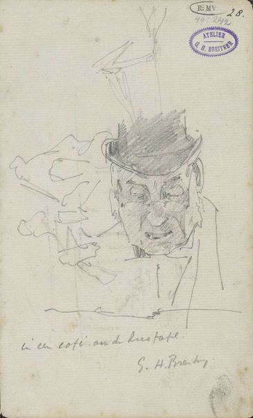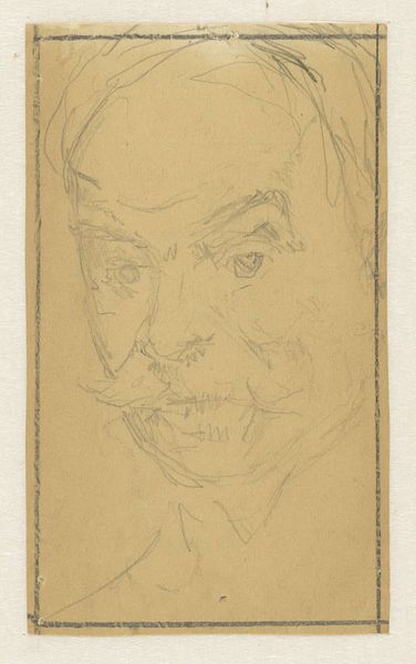 Curator: I'm immediately drawn to the ephemeral quality of this work. It’s a pencil and graphite drawing, "Portret van de schilder Jan Toorop," dating from 1874 to 1925, housed here at the Rijksmuseum. Editor: There’s a haunting unfinished quality, wouldn't you agree? A sense of transience evoked through the light touches of graphite and the exposed paper beneath. What can we say about the circumstances around its production? Curator: Well, the portrait is by Jan Veth, known for his literary work and critical voice, especially regarding social engagement in art. This rendering of Toorop offers insight into the cultural milieu of Dutch artists during this period. Consider how societal shifts might've influenced artistic expressions and interpersonal connections. Editor: The way Veth uses line, especially, is striking. Observe how some are boldly reinforced while others disappear almost into the ground. It reminds us that this is very much about representation and interpretation, as well as a personal style that’s visible in both contour and shadow. Curator: Indeed. Toorop himself was a pivotal figure in the Dutch art scene, blending Symbolism and Javanese influences, and engaging with politically charged themes within colonized territories. His life's narrative inevitably plays into how we read this particular portrait by Veth. Do you think this has to be a symbolic statement on Toorop himself? Or Veth's views? Editor: The contrast is essential here; in the formal treatment of planes that recede and assert themselves. Consider how that balance adds nuance to the figure of Toorop—revealing a certain... perhaps a thoughtful nature? An inquisitive gaze, rendered on the aged paper that might have stories of its own to tell. The interplay almost acts like visual counterpoint, don't you think? Curator: The image, especially when placed next to Toorop's historical artistic work and output, and the greater context of his views, allows us to consider relationships among artists of this period, the representation of cultural identity, and the subtle influences within artistic circles that informed each other. It's also such a quiet study in person. Editor: Agreed. It prompts deeper musings that go beyond aesthetics into considering broader philosophical underpinnings on representation and perception itself.