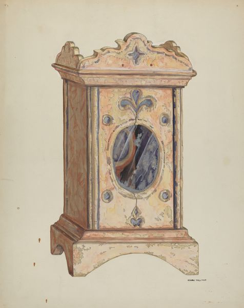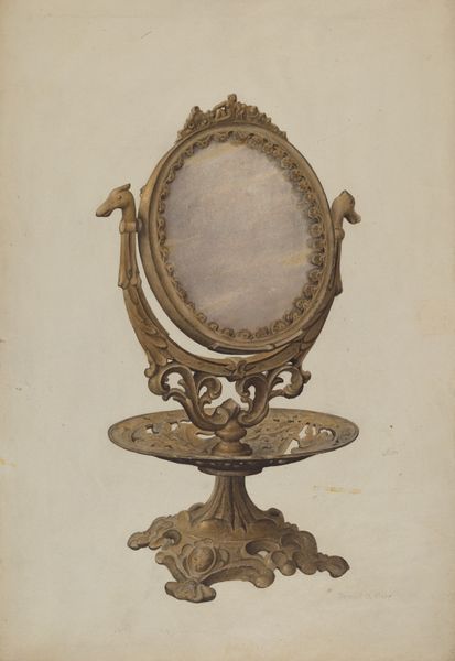 Curator: Looking at this "Mirror Frame" from the late 1930s or early 40s by David S. De Vault, I am immediately struck by how incredibly restrained yet ornate it appears. It's like holding your breath, isn’t it? What’s your first take? Editor: Austere elegance comes to mind. The colour palette is very subdued,almost sepia-toned. But that golden eagle perched on top—it adds a note of very intentional stateliness, bordering on nationalist symbolism. Was this artwork, or the aspiration behind it, somehow connected to the political sentiments of its time? Curator: Possibly. De Vault's intimacy with the design suggests a reflective, personal endeavor, though that period was deeply political, inevitably finding expression in art. To me, it’s also about the tension between crafted embellishment—notice the gilded trim—and raw, unadorned space. Editor: Yes, absolutely, and the blank space within the frame seems deliberate, maybe a void where identity gets projected or reflected, literally and figuratively. This invites questions about class, gender, and who traditionally had access to such domestic adornments. Was it meant for everyone to see themselves, or a privileged few? Curator: Intriguing. I had focused on the interplay between the artistic creation and the viewer. This reminds me of Virginia Woolf's notion of a room of one's own, a material reality intertwined with a quest for the inner self. The eagle almost feels protective over that reflected self. Editor: I read the eagle through a slightly different lens, seeing it as a symbol of power that also casts a shadow on who is granted the privilege of self-reflection. Who are the historical gatekeepers of such spaces? But I can’t deny it has a haunting presence—inviting multiple layers of inquiry. Curator: And I think this points towards its enduring appeal – it’s so intimate, yet so open to interpretation and so loaded with meaning, inviting viewers to step into that frame of questioning, time, and self. Thank you for the insight. Editor: It's been a fruitful exchange, offering just a few perspectives of many; context always makes art richer and relevant!