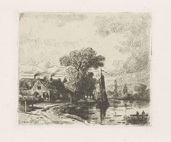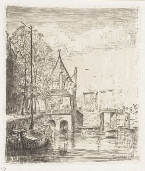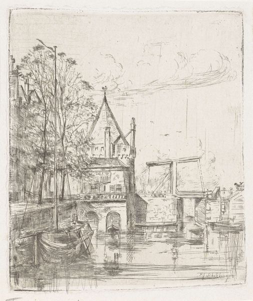 Editor: Here we have Frans Schikkinger's etching, "Gezicht op de Schreierstoren te Amsterdam," likely created between 1848 and 1902. It's a cityscape, almost ghostly with its pale tones. What strikes me is the contrast between the solid tower and the sketchier rendering of the water. What stands out to you in this piece? Curator: Considering its creation as an etching, it compels us to think about the industrialization of art during that era. Etchings like this made art more accessible to the middle class. What was once painstakingly rendered by hand could now be reproduced, influencing consumerism. Note the subject—not a grand palace, but a working city with a clearly important maritime building. What do you make of that choice? Editor: It's like the artist is elevating everyday life. Not depicting gods or nobles, but a functional, working building within the Amsterdam cityscape. Curator: Exactly. And the print medium underscores that democratization. Think of the labour involved, not just in the artist’s hand, but in the production of the printing press, the etching tools, the paper... These materials situate the art object within networks of production and consumption. Even the subtle gradations of tone achievable with etching demonstrate a control over the material that moves beyond mere representation. Editor: So, the etching technique itself and the urban subject are intrinsically linked to the rising middle class and industrial advancements. Curator: Precisely. The choice of subject reflects the artist's relationship to labor and commerce. How else can we view art of this period through a material lens? Editor: It reframes how I see this piece. It's not just a pretty picture; it is intertwined with economic and technological shifts of the 19th Century. Curator: Agreed, and understanding the materiality allows us to situate it within a richer historical and social framework.
