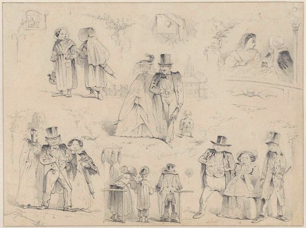 This is a graphite drawing by Lambertus Lingeman, titled "Studieblad met figuren, ruiters met honden en bomen". Note how Lingeman divides the page into distinct vignettes, each capturing a different aspect of the scene. Observe the figures – some standing, others riding, all rendered with a light, almost ethereal touch. The trees, sketched with delicate lines, frame and punctuate the composition. The choice of graphite as a medium contributes to the overall impression of transience, as if capturing fleeting moments in a dream. Lingeman seems less concerned with narrative and more with the interplay of forms and textures. The figures and landscapes, though representational, serve primarily as vehicles for exploring line, tone, and composition. In this way, the drawing operates as a semiotic system where the figures and landscapes do not simply represent real-world subjects; instead they become signs within a visual language. This destabilizes the conventional relationship between art and reality.