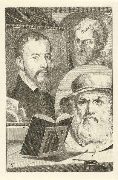 Jan l’ Admiral created this detailed print, ‘Double Portrait of Dirck and Wouter Pietersz. Crabeth’, using etching techniques. The immediate impact is in the symmetry and balance of the circular portraits set against the angular architectural backdrop. The monochromatic palette enhances the graphic quality, emphasizing texture and form. The composition is structured by contrasting shapes and lines. The portraits, encased in circles, soften the strict lines of the church interior, which includes the floor tiling, columns, and lighting fixtures. The lines of the church guide the eye upward, while the portraits anchor the composition, creating a balanced visual field. This print also prompts a semiotic exploration. The two men hold documents, possibly related to their professions or status, acting as signs of their identity. The architectural elements, like the columns, symbolize institutional power and religious context. This interplay of personal and public symbols encourages viewers to question fixed interpretations and consider the individuals within their societal roles. The visual grammar pushes us to consider the dynamic relationship between representation, power, and interpretation.