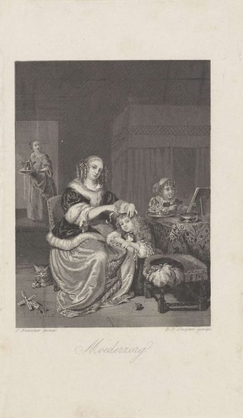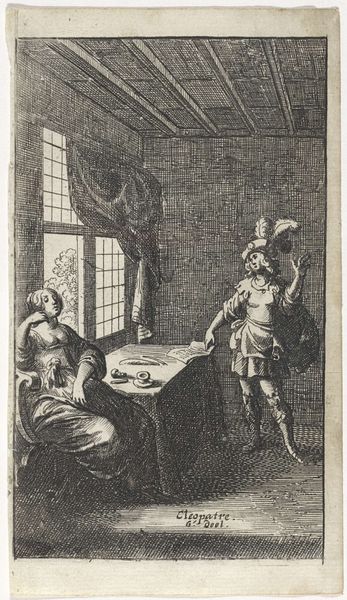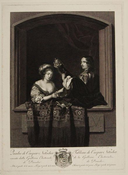 Jan Caspar Philips made this print, titled "Offering a Gift," sometime in the 18th century. During this period, the Dutch Republic was a major center for trade and culture, but also a society marked by strict social hierarchies. This image depicts a couple in what appears to be a domestic interior, exchanging gifts. The act of giving gifts here isn’t merely a personal exchange, but part of a larger social contract, especially regarding marriage and status. The inscription makes it clear that the gifts seal their commitment to marriage. The couple is carefully posed within a domestic interior, which reflects the period's emphasis on private life and the home as a site of social performance. Philips captures a moment laden with societal expectations, presenting marriage not just as a union of individuals, but as a public affirmation of social order.