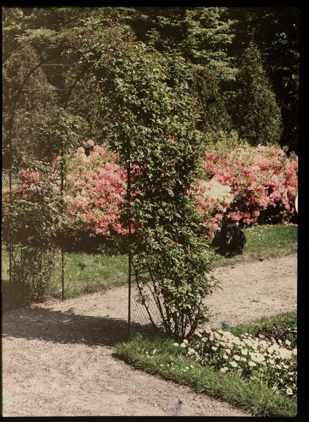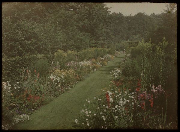 Curator: Looking at "Gezicht in een park", which translates to "View in a Park," we have a photographic landscape, thought to have been created sometime between 1907 and 1930 by Adolphe Burdet. The artwork is currently housed at the Rijksmuseum. Editor: It's immediately calming. The gentle winding path pulls the eye deep into the composition, promising quiet and seclusion. The hazy tonality really supports this effect. Curator: Indeed. Notice how Burdet uses the S-curve of the path not only to draw us in but also to divide the composition. On one side, we have masses of richly colored rhododendrons. Editor: Almost a riot of color. The contrast with the monochromatic path creates a fascinating visual tension, the blooms symbolize beauty but in photography and in painting are strongly linked with fragility. Curator: Quite. The darker greens mass towards the top, which presses downwards somewhat, it’s interesting to note how much tonal similarity there is between the canopy, sky and the path. This flattened field almost creates a shallow depth, and the photographic methods have really muted tones throughout, further compressing perspective. Editor: I would suggest the lack of perspective is an indication of both passing of time and nostalgia – the photograph becomes dream-like, almost a memory of a time or place, or even feeling of the subject of the photograph. The gate at the top right could therefore indicate change or challenge; and its colour is indicative of peace and harmony. Curator: I think that the overall impact of the photograph relies quite strongly on tonal relationships – this quiet park vista is not spectacular as an individual park-like area, but more how it makes the audience contemplate what they are observing due to tone, depth and texture. Editor: For me, it echoes a time when leisure was prioritized, and nature was considered as a means of contemplative refuge, however for both to coincide is extremely rare to experience. It prompts us to consider our cultural relationship with the natural world and it’s significance in our memory.