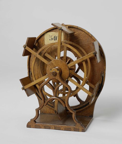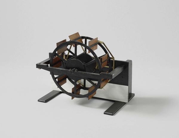 Editor: Here we have an early 19th-century model of an artillery crane. It is made with wood and metal, and held at the Rijksmuseum. It looks almost like a children’s toy, a teaching tool that shows how mechanics operate. What details do you find compelling? Curator: The proportional relationships are meticulously constructed. Observe how the circularity of the wheel counterbalances the rectilinear structure of the crane’s arm. The artist, though perhaps unconsciously, invites the viewer to perceive the interplay between volume and line. Editor: So it's more about the shapes than its function as a tool? Curator: Precisely. The artist’s intent, perhaps, lay not in documenting engineering prowess, but in exploring a formal arrangement of shapes and masses. Consider the material reality: the wood's grain, the metal's sheen. Do they not also contribute to an aesthetic end? Editor: Definitely, the rough textures play a big part! Looking at it this way, it brings a certain beauty to engineering. I didn’t consider the intent behind its shape. Curator: The composition guides our eye vertically, the lines almost like the ascent in Gothic architecture, reaching towards something… greater than the materials themselves. A semiotic interpretation suggests that the parts constitute more than the whole, perhaps representing 19th-century attitudes toward scientific progress and aspiration. Editor: I never considered sculpture capable of achieving that much in terms of symbolism, given its function! Thanks for shedding light on its artistry beyond engineering! Curator: Indeed, exploring art is about unveiling how its parts constitute meaning. It gives insight not only into forms, but also into what is unseen.