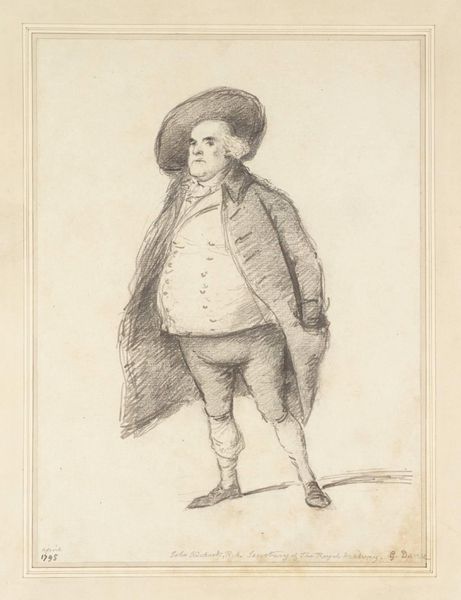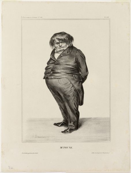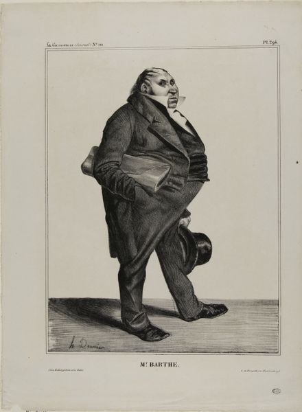 Curator: This is a print entitled "Major, Baron Pechlin" created sometime between 1829 and 1899 by H.P. Hansen, housed right here at the Statens Museum for Kunst. What’s your initial take? Editor: My first thought? An utter fascination with the material culture of status and satire colliding. The baron’s physique practically spills out of the frame. Curator: It does, doesn't it? Hansen really emphasizes the... largeness, I suppose. The figure almost feels inflated, like a commentary on the excess associated with a certain class. The lines of the engraving really draw attention to the bulk of the man. Editor: Absolutely! And let’s consider the production of this image. Engraving, a meticulously laborious printmaking technique, used to circulate this biting portrayal far and wide. Think about it—the baron's image, multiplied and dispersed. Is it shaming? Lampooning? Or just acknowledging the very visible symbols of bourgeois excess? Curator: It's likely a mix, I suspect. The exaggerated features certainly point towards satire, but there's also a certain... groundedness? Despite the caricature, he stands firmly. What I find so compelling is the sense of genre painting meeting the traditions of portraiture—as a method for expressing personal and even social status. Editor: And that hat! Perfectly placed, and essential. I wonder about the social context in Copenhagen when H.P. Hansen created this image? Did it strike a nerve with those in power? What did those outside of the inner circle think when images like this circulated through the world? Curator: It's a puzzle, isn’t it? A moment frozen in ink and paper, inviting us to speculate, connect, and yes, perhaps even smirk a little at the follies of those who came before. Editor: A potent reminder that materials—ink, paper, even sartorial choices—tell stories more complex than meets the eye. I came expecting art and was delighted with some social commentary! Curator: Me too, as always, the way art creates a conversation between who we were, and who we aspire to be is incredible. Thanks for bringing the sharp analysis, its so important that we allow history and beauty to meet!