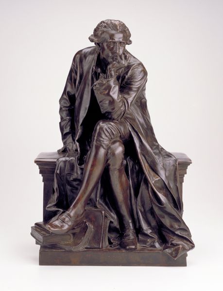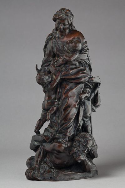 Curator: Here we have a bronze sculpture, "Countess Matilda of Tuscany," its creator remains unknown. Editor: She looks rather severe, yet there's a certain fluidity in the drapery that softens the overall impression. It's as if she's caught in a moment of both power and grace. Curator: The materiality of the bronze itself is significant; the methods used to cast such a piece would have been incredibly labor-intensive and therefore costly, reflecting Matilda's high status and influence. Editor: Bronze gives it such heft, though. It makes me think of the weight of responsibility she carried—holding what looks like a miniature fortress, almost protective. Curator: Indeed. The fortress could symbolize her military might and strategic acumen. The production process, involving skilled labor and resource extraction, underscores a system of social hierarchy. Editor: I see her, though, almost trapped by the weight of her power, beautiful but burdened. Curator: A potent reminder of the intersection of art, power, and the labor that enables both. Editor: Makes you wonder about all the invisible hands that helped her story become so permanent.