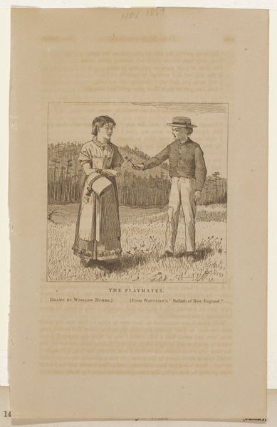 Curator: Nicolas Toussaint Charlet created this intriguing lithograph around 1840, currently held in the Rijksmuseum collection. Its title translates to "High Official Addresses Gardener." Editor: It feels very much of its time. Somber, but with this hidden undercurrent of wit. Is it just me, or can you sense the subtle power dynamics crackling off this image? Curator: Absolutely. Note how Charlet orchestrates our focus, framing the official on the right and the gardener on the left in this very contrasted but balanced composition. The formal attire of the official against the simple work clothes makes their hierarchy very obvious. Editor: And that gaze! The high official is looking down on the poor man as he speaks with one hand opened and a small smirk. Meanwhile, the gardener is looking at the horizon with a concerned facial expression that might indicate some form of disrespect. Is that what Charlet tried to depict with this scene? Curator: Perhaps. The contrasts of light and shadow work in harmony with these figures, underscoring an ideological disparity that certainly speaks volumes about societal hierarchies. Note the formalist construction. The way the artist carefully delineates these details and the surrounding landscape gives this lithograph much of its narrative weight. Editor: I’m struck by how timeless this image feels. Despite the antiquated clothing, you can pluck those power dynamics into modern times, into current power settings between "white collar" and "blue collar". Art is supposed to create discussion around themes like power relations that might still hold true to this day, which Charlet perfectly executed. Curator: A fitting final thought! "Hoge ambtenaar spreekt tuinman aan" invites sustained analysis precisely because of its interplay between immediate aesthetic qualities and latent social commentary, an approach which situates Charlet's work so strongly within Romanticism. Editor: Well, this was certainly enlightening. I’m leaving with a newfound appreciation of romantic-era art, and maybe, just maybe, a burning urge to prune something myself.