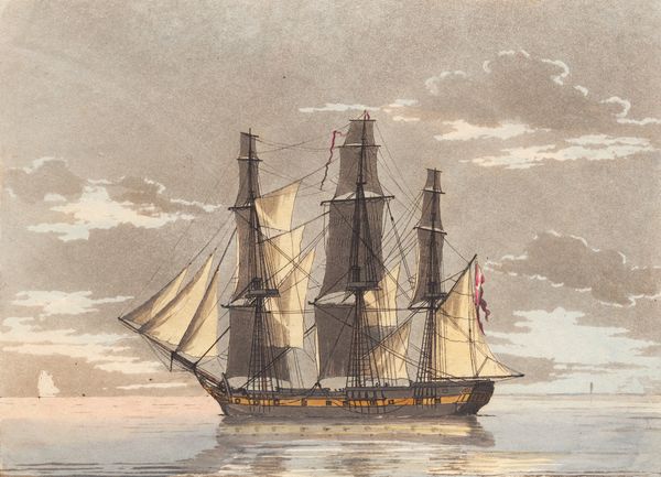 Editor: We’re looking at "A Danish Leaship, Seen in Lee, with Side Wind" created in 1805 by Niels Truslew. It seems to be a watercolor painting, combined with aquatint and colored pencil, that depicts a fully rigged ship sailing on the open sea. The overall feeling I get is one of adventure and perhaps a little bit of the unknown. What strikes you most about this work? Curator: The most prominent thing for me is how this image weaves together pride and vulnerability. Ships, especially in the Romantic era, often stood as potent symbols. What does a ship signify to you? Editor: Independence, exploration, but also a sense of being at the mercy of the elements. Curator: Exactly. The Danish flag flying from the mast evokes national pride and maritime power, a desire to project strength. However, notice how the ship is positioned "in lee," sheltering from the wind. The ship is not sailing directly into the wind. This choice hints at the unpredictability and challenges faced at sea. Do you sense any tension between these two symbols? Editor: Yes, absolutely. It is like the painting recognizes the reality of the ship's journey and what might be required for it to survive. Curator: Furthermore, water itself is laden with symbolic meaning. How has the depiction of the sea been used as a symbol across different historical eras? Consider shipwrecks, the Titanic, or even the imagery in religious art like the parting of the Red Sea, what cultural themes link these events to a specific relationship to water? Editor: That's really insightful, and gives me a much broader sense of this piece. Thanks for opening my eyes to the symbolism at play. Curator: And thank you. Examining Truslew's ship through a symbolic lens reveals layers of meaning we might have missed at first glance.
