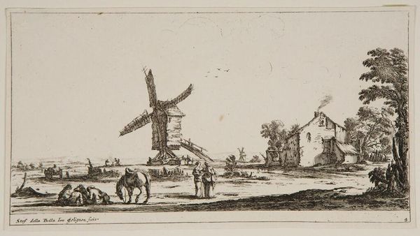 Esaias van de Velde created this print, "Farm by a Canal," using etching techniques. Notice how the composition guides your eye from the darker, densely etched trees on the left to the lighter, more open sky on the right. The structure of the image is built on contrasts: light versus dark, open versus closed spaces, and natural versus man-made elements. These contrasts might suggest van de Velde's exploration of the relationship between humanity and nature, a common theme in Dutch Golden Age art. See how the figures are placed at the lower right, almost as an afterthought. It's a study of how the natural and built environments shape human experience. The etching's lines, though delicate, create a sense of depth, pushing the background further away and emphasizing the flatness of the picture plane. It invites us to consider how art constructs our understanding of space and reality, challenging us to reconsider our perceptions.