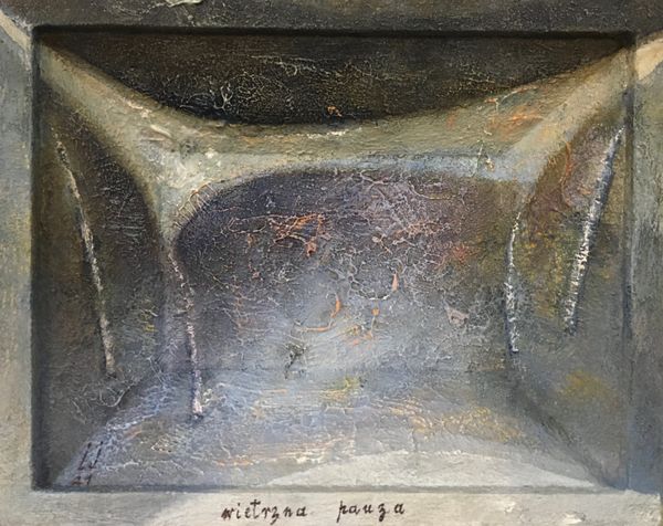 Lech Jankowski created Szary chór kurzu, or Grey Chorus of Dust, using what appears to be paint and mixed media on a small panel. The picture looks like an empty, distressed room, rendered in layered, textured paint. The artist has manipulated the material to evoke the build-up of time, with the titular dust becoming almost tangible. The work is framed within a thick border, adding to the sense of a confined, perhaps even claustrophobic space. The visible layering suggests a slow process of accumulation, much like the dust it depicts. It begs the question: is this an image about labor and its absence? Is the artist subtly commenting on the often-invisible work required to maintain and clean such a space? By focusing our attention on the tactile qualities of this artwork, and on the traces of labor it evokes, we can appreciate how Jankowski elevates the mundane to a subject worthy of contemplation, blurring the boundaries between painting and sculpture, craft and fine art.