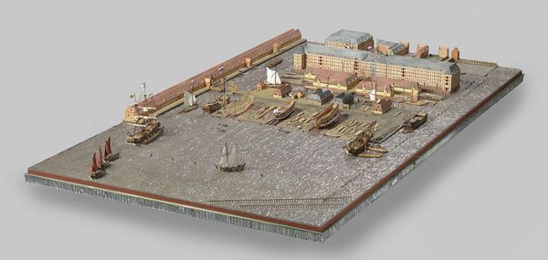 Editor: This striking model of the Double Dry Dock at Hellevoetsluis, dating back to around 1805, just blows my mind. It's wood, right? The level of detail...it feels both incredibly precise and kind of haunting. What's your take? What do you see when you look at it? Curator: Well, isn't it evocative? I find myself almost *feeling* the weight of history here. It’s more than just a scale model. It whispers stories of ambition, of naval power, of a time when wood and wind ruled the waves. Think of it – each meticulously carved timber reflecting a larger-than-life ambition. But tell me, what *don’t* you see? The human element, the workers toiling away – it's a ghost image we have to supply. Editor: You’re right, it’s incredibly… sterile, almost. Given that this would have been a hive of activity. How accurate would you say these models were? Were they just for show, or functional in some way? Curator: That's the magic, isn't it? It served as a design blueprint and a powerful statement! Can you imagine the patron gazing at it and envisioning mighty warships taking shape? The *idea* of progress solidified into crafted miniature. Editor: So, it's a Neoclassical power move, visualized in miniature. The Dutch flexing their… naval muscles? Curator: Precisely! And in a world obsessed with rationalism and order, this beautifully controlled model is the perfect metaphor. It is solid power frozen in time! And I also love the contrast between something so large and important rendered with a degree of human care. Editor: I hadn't considered that, the personal touch in something intended to project power and precision. Thank you; I definitely see this piece in a new light now. Curator: And that's the fun of art, isn't it? A new set of eyes always finds a new gleam of sunlight that the piece radiates to others!