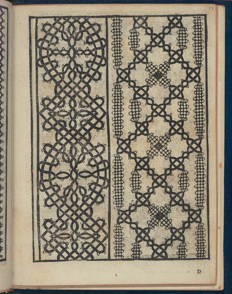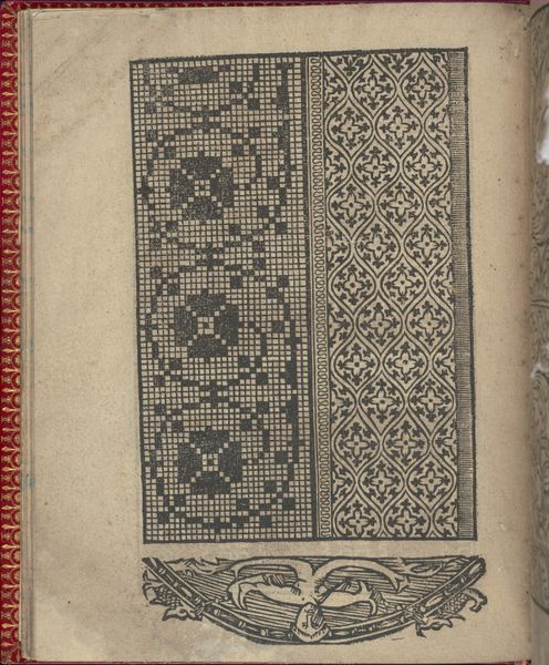Curator: Take a look at this fascinating page from "Le Pompe: Opera Nova," printed in 1557 by Giovanni Battista and Marchio Sessa. It's an early example of printed lace patterns. What's your immediate reaction? Editor: Intricate. Almost dizzying, but in a good way. The density of the black lines against that toned paper creates a hypnotic effect. It’s a visual maze. I can see how this was once very functional and aesthetically quite advanced. Curator: It's more than just pretty pictures. This was essentially a pattern book, guiding lacemakers in creating intricate needle lace, "punto in aria" – stitches in the air. Consider the immense skill and labor involved. Each pattern represents hours upon hours of painstaking work by artisans, predominantly women. Editor: Absolutely. And this book is also an early example of the mass production and dissemination of designs that could shape labor on an unprecedented scale. These aren’t unique objects in that sense, and yet there's incredible sophistication in translating three-dimensional possibilities into graphic form. Do we know who the intended audience for these books was? Was it exclusively for professional lace makers? Curator: These books probably found their way into the hands of noblewomen as well as professional artisans. Imagine, a wealthy woman commissioning a gown with lace directly inspired by this page. Talk about conspicuous consumption merged with skilled handiwork! It's such a potent mix. Editor: And thinking about materials - the quality of the thread, the availability of paper for printing – it really speaks volumes about access and social hierarchies of the time. This book, at the moment of its publication, became both a creative force and a powerful form of propaganda. I want to dive in a bit to see where these patterns migrated; perhaps a globalized product by any other name… Curator: A truly interesting observation and a vital link between social context and production that often goes unnoticed. So, the next time you admire intricate lace, think of the hands that brought it into being, guided by patterns meticulously preserved in volumes like this one. What do you see and how might that illuminate history?