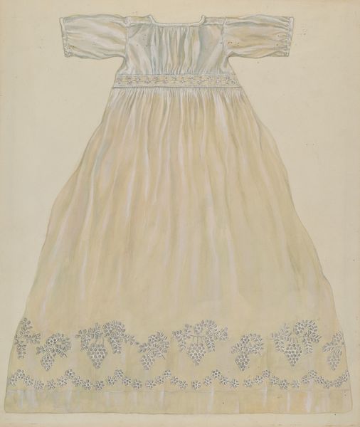 Editor: This is Julia C. Brush’s "Study for Quilted Petticoat," created sometime between 1935 and 1942. It’s a pretty straightforward drawing of a skirt – makes me think about historical fashion, something almost costume-like. What grabs you when you look at this? Curator: Well, the deceptive simplicity, for one. It’s a drawing, but really a document, pointing us towards a network of making. This isn't "high art" in the traditional sense; it's closer to a pattern, a tool. Think of the labor involved: the quilter's hands, the materials themselves, the social context of clothing production during that time. Editor: So you see it as less about aesthetics and more about…process? The work itself seems almost like a set of instructions for something bigger than just a drawing. Curator: Precisely. The visual appearance is almost secondary to the physical act it represents. This connects directly to material culture – how are these petticoats actually being used and consumed? How did they circulate? Was the drawing maybe even aspirational to certain demographics or social classes during that era? Editor: It’s fascinating to think about fashion as a form of material culture and the economic systems propping up a single article of clothing! Curator: Consider the material value placed on clothing in different historical periods. What does it tell us about gender roles, economic status, and the very fabric of society itself? Each stitch, each fold, tells a story of production and consumption. Editor: I guess I'd been overlooking the whole scope of the labor behind what might feel like a fairly standard garment. This makes you think twice about every element—the materials used and even where and by whom it might have been worn, manufactured and bought. Curator: Exactly, by looking through a material lens it forces us to think about value, production, labor and so many cultural meanings and how deeply they resonate in art.