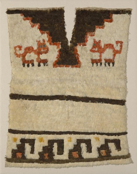 This fragment was made by the Chancay people of ancient Peru, likely sometime between 1000 and 1500 AD. The textile is a window into a sophisticated society navigating life between the desert and the coast. The Chancay were known for their weaving, and textiles were not just beautiful; they were a language. This fragment is rich with abstract figures of humans and animals, woven into a complex narrative. What stories did this textile tell? The fragment is also evidence of how the Chancay people defied limitations. Living in a challenging environment, they transformed raw materials into vibrant cultural expressions. Their weavings were used in daily life, as well as in elaborate funerary rituals, underscoring the interconnectedness of life and death. The fragment invites us to consider the ingenuity, resilience, and artistry of a culture that thrived centuries ago. It echoes the voices of the Chancay, who wove their world, their beliefs, and their identities into every thread.