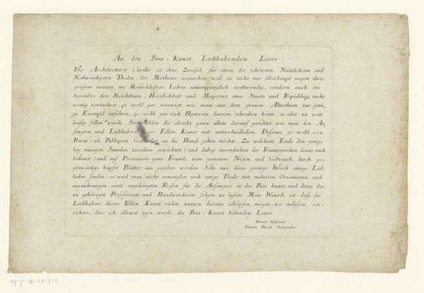 Curator: Here we have “Tekstblad,” or “Text Sheet,” a print from 1729. The artist is anonymous, and it’s made using engraving on paper, a rather common technique for mass communication at the time. Editor: It seems pretty straightforward—just text on a page, framed by simple lines. Given that it is from the 18th century, it does seem quite formal and serious, doesn’t it? How do you interpret this work, especially in terms of its original context? Curator: It's easy to see it simply as a historical document. However, remember that printmaking was a powerful tool, especially in an era of limited literacy. Who was this message for, and what were they trying to achieve by disseminating this text? It prompts questions about power structures, about who had access to information, and what they could do with it. Editor: That's a really interesting perspective. I hadn't considered the role of print in shaping social dynamics and influencing public opinion back then. Curator: Exactly. Consider how similar technologies function today – who controls the narrative? This isn't just a text sheet; it's a lens through which we can examine 18th-century power dynamics. The ability to produce and distribute such printed materials would be limited to specific groups or individuals. So, this becomes an insight into class, authority, even censorship. What do you think? Editor: Thinking about it that way, this isn’t just an informative text anymore. It embodies all the power structures and socio-economic conditions of the time, doesn’t it? Curator: Precisely. Editor: I definitely have a richer understanding of this print now. Thanks for highlighting the deeper context behind this simple-seeming "Tekstblad.” Curator: Likewise, I'm happy we could shed light on how historical artifacts continue to hold relevance today, as political objects.