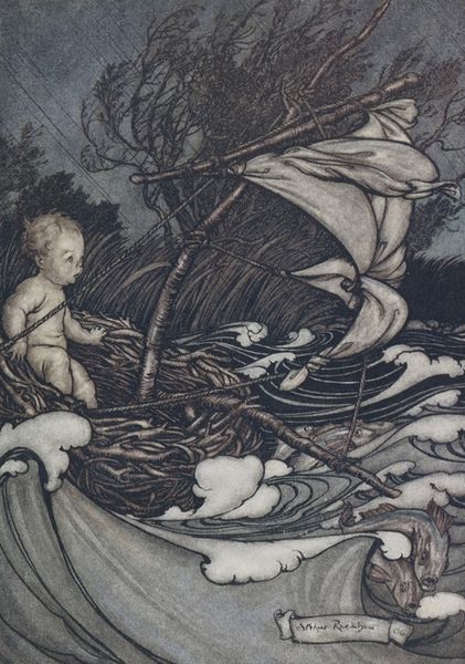 Curator: This is "Becuma of the White Skin," created in 1920 by Arthur Rackham, using ink and watercolor. What springs to mind for you? Editor: It’s pure enchanted dread! I feel swallowed by this world of brooding greens and grays...that looming forest feels oppressive, those hulking toads with their vacant stares. Chilling, yet captivating! Curator: Indeed. Rackham masterfully employs line and wash to create texture, particularly within the rendering of the figures and the subtle layering of forms. Note how the distribution of values, graduating from the lighter shades towards the center, leads the eye through the space to the Becuma figure and her opposition in an extremely cunning way. Editor: Yes, Becuma's a beacon of steely resolve surrounded by all this… well, froggy doom! But what is it all supposed to represent? This feels like something ripped from the oldest kind of fairy tale... you know, the ones before sanitization. Curator: Precisely! Rackham was deeply engaged with folklore and mythology, which often drew inspiration from darker Romantic landscapes, often playing out dramas of moral challenge. Here he pulls from Celtic lore. "Becuma of the White Skin" illustrates a figure from Irish myth; exiled Queen Becuma, known for instigating conflicts among mortals after marrying an Irish King. Editor: That adds a layer, doesn't it? So the threatening environment might reflect her tumultuous presence, that discord she brought to the kingdom! Are the toads symbols of ugliness, internal corruption? It's unsettling, definitely, a place you wouldn't want to be stuck for even a minute. The very antithesis of 'pastoral.' Curator: One could consider them representative of that kind of defilement and degradation; Rackham utilizes a muted, earthen palette punctuated by glimmers of steely grey that enhance the ambiance of creeping decay and unavoidable dread. The landscape becomes an allegory, rendered in both overt symbol and implicit textural quality. Editor: Rackham's vision, though unsettling, feels potent. It's more than illustration; it’s a visceral, cautionary experience. "Becuma" lingers in the mind as something uncomfortably true, you know? Even as a dream... Curator: And this fusion of aesthetic mastery and symbolic weight is precisely where the essence of enduring artwork lies. The balance between both tangible representation, and abstracted meaning create the art's lasting appeal.