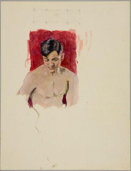 Curator: This is Denman Waldo Ross's "Half-Length Male Nude," held here at the Harvard Art Museums. What strikes you first about it? Editor: The stark vulnerability. The sketch-like quality and raw expression of the subject's form feel so intimate and immediate. Curator: It's interesting you say that. Ross was a pivotal figure in the Arts and Crafts movement, advocating for art's accessibility and its role in everyday life. Editor: Absolutely. I see that in the artist's technique. The exposed grid lines suggest a pedagogical approach, hinting at the transmission of knowledge and democratizing artistic skill. Curator: Ross’s theories on color and design shaped art education. His influence extended to figures like Anni Albers, impacting the Bauhaus movement. Editor: And while the male nude is often associated with power and idealization, this piece feels like a study in progress, an honest portrayal of the human form. Curator: Ross’s legacy underscores the importance of art as a social practice, shaping the creative landscape of the 20th century and beyond. Editor: It reminds us that art can be a tool for empowerment and a reflection of our shared humanity.