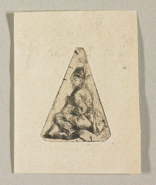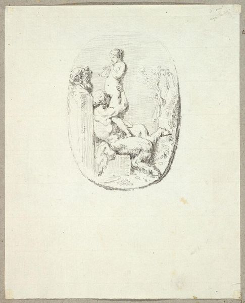 Editor: This small etching, "Aftermath" by Arthur Bowen Davies, features figures in a shallow space. It feels like a memory, dreamlike and fragile. What social structures do you think this piece speaks to? Curator: Considering Davies’s era, I see a critique of societal constraints placed on the body, particularly the female body. The figures, though seemingly free in movement, are confined within this almost tomb-like frame. Do you see a tension between freedom and confinement? Editor: I hadn’t thought of it that way, but yes, there is that tension. The figures seem to be struggling, and that shape encloses them. Curator: Exactly. Davies was working during a time of significant social upheaval and changing roles for women. The figures, perhaps, embody this struggle for liberation within existing power structures. Seeing it this way, the title "Aftermath" gains a sharper edge, right? Editor: It does. Thanks, that really reframes my understanding of it!