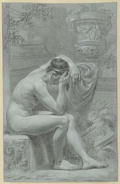 Curator: Looking at this somber pencil drawing by Jean Grandjean titled, "Zittend mannelijk naakt, met een stok, naar links gedraaid," which translates to "Seated Male Nude, with a stick, turned to the left", and created sometime between 1765 and 1781, I find it surprisingly evocative despite its monochromatic nature. What are your first thoughts? Editor: Immediately, I’m struck by the man's posture. The way he leans into the staff, head bowed… It conveys a sense of exhaustion or perhaps contemplation. The entire composition has a subdued, almost melancholic feeling. Curator: That resonates with me. The positioning of the nude male figure is rather classical in its approach but note how Grandjean disrupts that idealism. He gives us this vulnerability. There's no heroic action, only the suggestion of burden or quiet reflection. His reliance on academic art is unmistakable in that, it invites conversation about masculinity beyond strength. Editor: Indeed. It's almost as if he's a classical figure stripped of his mythological armor. I keep returning to the stick or staff he’s leaning on. In many visual traditions, a staff symbolizes authority or pilgrimage. But here, it seems to function more as a crutch—suggesting a different narrative entirely. A cultural subversion. Curator: Precisely! And consider the social conditions that existed at the time this work was created: The latter half of the 18th century saw growing intellectual foment surrounding notions of gender, reason, and naturalism. Grandjean is actively, albeit subtly, reframing archetypes and expectations. This re-interpretation might challenge or subvert accepted paradigms of its time. Editor: That’s a compelling point. Looking again, there’s a sense of ambiguity about the setting, the half-visible gateway behind him and vegetation... Almost dreamlike and filled with encoded references. One can feel the impact of neaclassicism style! Curator: I agree. Grandjean, with simple tools, provides space for a poignant social commentary on identity. Editor: It gives one a fresh insight into reconsidering masculinity. Thank you! Curator: An enriching experience indeed!