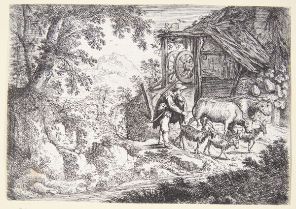 Curator: This is Étienne Delaune's "November," currently housed at the Harvard Art Museums. The crisp, almost clinical linework immediately strikes me. Editor: It's pastoral, idyllic...a rather romanticized view of labor, isn't it? Curator: Certainly, the depiction of a swineherd seems to draw on classical tropes, but also reflects the material reality of agricultural labor. His tools, his connection to the animals... Editor: And that figure working with wood in the background? Are we meant to see a division of labor? Are these the material roots of society, presented without critique? Curator: Perhaps Delaune is prompting us to consider the foundations of societal structures, acknowledging the often-overlooked contributions of those engaged in physical labor. Editor: It leaves you pondering the narratives we construct around work and value. Curator: Indeed, and how those narratives shape our understanding of ourselves within larger power structures.