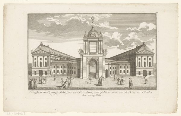 This is an etching of the Palais des Prinzen Heinrich in Berlin, made by an anonymous artist. The print uses line and perspective to define the imposing structure of the palace and the vast public space in front. The composition is anchored by the palace itself, a symmetrical, almost monumental form that dominates the horizon line. The artist contrasts the static architecture with the dynamic arrangement of the clouds above, creating a semiotic interplay between the permanence of power and the transient nature of the atmosphere. Small figures populate the foreground, giving scale to the building, while the clouds mimic its structure. The very act of representing the palace, of framing it within the lines of this etching, reflects a desire to understand space and power. Consider the way light and shadow are rendered, how the rigid lines of the palace meet the soft undulation of the clouds. These formal qualities suggest a dialogue between stability and change, order and chaos, inviting us to question the very nature of the world we inhabit.