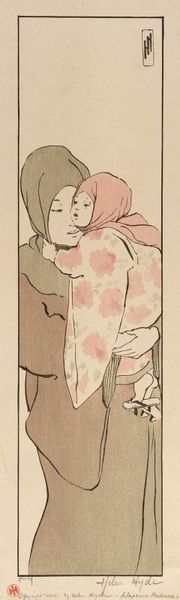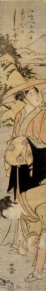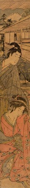 Curator: This is "Geisha and Servant Walking" by Torii Kiyonaga, a Japanese Ukiyo-e artist who lived from 1752 to 1815. It's a paper print, a tall, narrow composition that immediately strikes me as graceful. What are your initial thoughts? Editor: It feels deceptively serene. The stylization flattens the figures, but it can't hide the codified hierarchy; the slight bow of the servant's head is particularly telling. Curator: The placement of the feet, the slight elevation of the Geisha, and the attention to the Geisha's kimono; these all point to a visual language of status that would have been instantly readable. The layered kimonos have meaning. Editor: And the blank background further emphasizes their social roles, divorced from any natural or humanizing context. It feels like a study of power dynamics, rendered in the soft colors and elegant lines of Ukiyo-e. Curator: Indeed, the cultural context is important. The artwork preserves a certain moment, and its status for the women portrayed. Editor: Absolutely. Even in its beauty, it reveals the subtle yet pervasive systems of control inherent in that society. It's a poignant reminder that art can both reflect and critique.