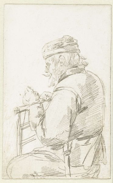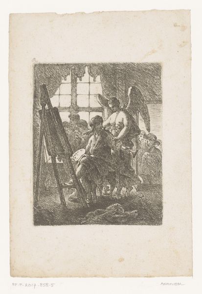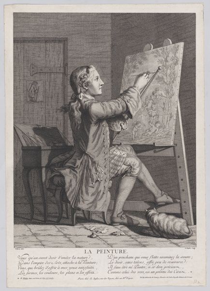 Robert Brichet created this print of a painter seated at his easel sometime between 1750 and 1850. The image is titled "Le Peintre," or "The Painter," in French. The print offers a glimpse into the world of artistic production during a time when art academies were solidifying their influence. Look closely, and you'll notice the artist's attire, the tools of his trade, and the subject of his painting; each aspect reflecting the social status and cultural values of the time. The artist appears somewhat disheveled, in contrast to the idealized images often produced at the time. This perhaps, offers a commentary on the artist's own position within the art world. Consider how Brichet, as an artist himself, might be using this image to reflect on the role of the artist in society, and perhaps also to question or subvert some of the prevailing norms of artistic representation. What does it mean to depict an artist who is both creator and subject, both in control and perhaps also a little vulnerable?
