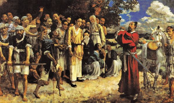 Editor: So, here we have "The Refugees of Parga" painted in 1831 by Francesco Hayez, using oil paints. There’s this overwhelming sense of… impending doom, I think, but also a strange stoicism. What's your take on this piece? What do you see in it? Curator: Oh, a heart-rending symphony in sepia tones, wouldn't you say? This painting sings to me of loss, of fractured identities clinging to tattered remnants of hope. Notice how Hayez crafts a narrative spine, drawing our gaze upwards, not towards divine intervention but towards the fiery specter of their abandoned home. It makes you wonder, doesn't it, what price these souls paid for their fleeting breath of freedom. But is it really "freedom" if their spirits remain shackled to that burning city, eh? Editor: I hadn’t considered that maybe they weren’t free, just displaced. Is the painting trying to make a political point? Curator: Absolutely. History paintings often whisper uncomfortable truths. Parga, you see, was a pawn in a larger game. The refugees weren’t just escaping fire, they were escaping betrayal, sold out by powerful nations to Ottoman rule. Hayez doesn't just paint their faces, he etches their plight into the collective consciousness, reminding us that history is not some dusty tome, but a bleeding wound. Notice the priest, how somber and grounded he seems in contrast to the dramatic desperation of everyone else, especially as you see their upward, beseeching gazes… what’s he doing? What are they hoping for? Editor: I see it now - the desperation, the feeling of being betrayed… It’s so different now knowing all of this. Curator: It all unravels, doesn’t it? Isn’t that what makes art so damned fascinating? We enter with our assumptions, our preconceived notions and, if the art does its job, we exit slightly altered, forever carrying a piece of its story within us. It haunts and it changes! Editor: Haunting is a great word. Thanks for the insights, this was incredibly illuminating!