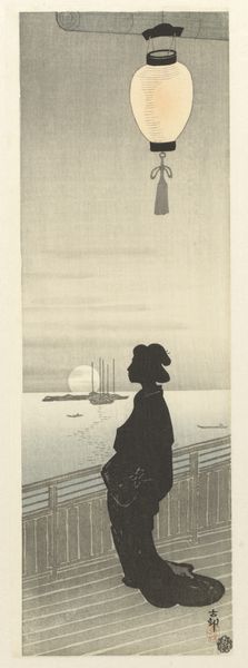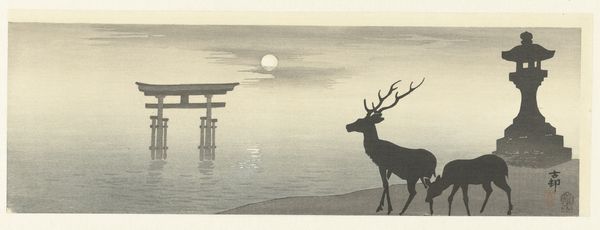 Curator: Let’s pause for a moment here, in front of Ohara Koson's "Man en paard," created sometime between 1900 and 1910. Look at the delicate tones! Editor: It’s so quiet, almost hushed. The water looks cold. I imagine that small figure in the print is freezing but compelled, in service to the horse, their working companion. Curator: Exactly. This work, done with ink and colors on paper, embodies Ukiyo-e, a popular style of Japanese printmaking from the Edo period. Koson masterfully blends traditional techniques with his unique perspective. Editor: Ink on paper. Labor intensive! These prints speak volumes about a whole matrix of labor, from papermaking, ink production, the felling of the tree to make woodblocks, the work of the printer carefully inking the block... Curator: The lone figure and horse become almost monolithic silhouettes. It really draws the eye into the emotional core of the scene, focusing on this co-dependence between the man and animal. Editor: The material scarcity somehow emphasizes that emotional link. The minimal use of ink underscores labor, and evokes quiet perseverance in the face of hardship. Curator: I feel there's almost a melancholic tenderness—the bond isn't overt but there. Look at the way the man’s hand almost caresses the horse. Editor: Yes! It reminds us that the production and consumption of art always involves relationships, economic realities, and yes, quiet, desperate beauty, such as that shared here, perhaps unwillingly, by horse and human. Curator: What I find truly moving is Koson’s ability to create such intimacy with such incredibly reduced means, focusing instead on light and shadow, gesture and posture. Editor: Absolutely. These prints are artifacts that speak volumes not only about aesthetics, but also about lives lived, materials handled, and work undertaken. It’s humbling.