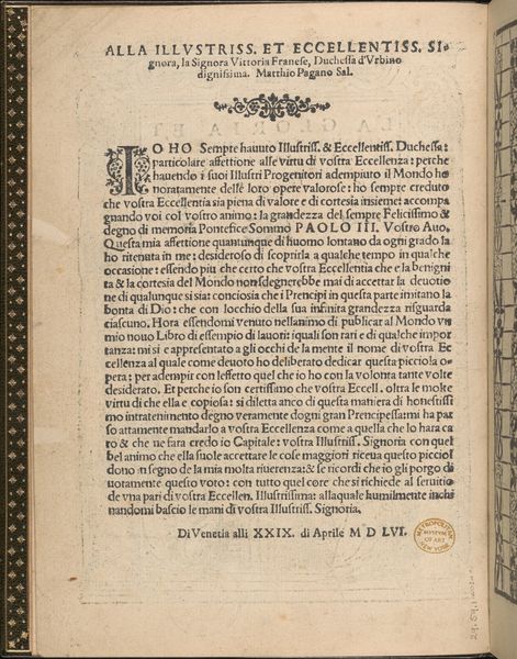 Editor: Here we have "Les Singuliers et Nouveaux Portraicts... page 4 (recto)," dating to 1588. It’s a print on paper, attributed to Federico de Vinciolo. It seems to be a page from a book displaying typography. I’m struck by how ornate the initial letter is, and the delicate border design at the top. How do you interpret this work? Curator: I see this page not merely as a display of typography but as a carefully constructed articulation of power dynamics within Renaissance society. The dedication "A la Royne"—to the Queen—is central. Let’s think about the textile patterns, presented in printed form. Who were these patterns *for*, and who had access to them? How might this book have participated in defining and reinforcing gender roles? Editor: It's interesting to consider how the Queen fits into this. You’re suggesting that this book may have served as more than just a pattern book? Curator: Absolutely. The author positions himself as a humble servant, offering his designs for her pleasure and for the benefit of France. Consider the implications of cultural and economic exchange within a courtly context: The designs were presented to elicit royal favor. Do you think that presentation transcends mere service to the queen? What sort of status and economic gain could be possible as the Queen’s chosen designer? Editor: I see what you mean! The patterns, the words… everything is orchestrated to appeal to, and perhaps even subtly influence, the Queen. I never considered how much the social and political environment impacted even seemingly simple things such as a textiles pattern book! Curator: Indeed. Examining this page reveals not just aesthetic preferences but also the intricate web of power, patronage, and gender within which art was created and circulated in the Renaissance. I am going to read more about courtly love and look more at women in power at the time, perhaps it might bring something of use. Editor: Yes, me too! It's fascinating to realize there’s a deeper meaning behind what seems to be a simple design book!