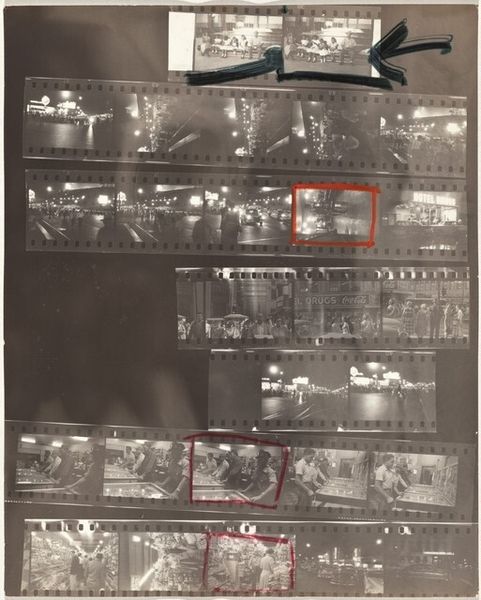 Editor: We’re looking at Robert Frank’s “Guggenheim 450--Los Angeles”, from 1955-56, a gelatin silver print showing a full contact sheet. It's mostly night scenes, and there are these red markings – an X over one frame, circles around others. It gives a gritty, almost voyeuristic feel, like peeking at discarded memories. What do you see in this contact sheet, looking at it symbolically? Curator: I see fragments of urban life, suspended between memory and the discarded. Frank is very interested in how symbols emerge from these modern landscapes, wouldn't you agree? Editor: Absolutely! It feels almost like a coded language. Curator: Indeed! Look at the darkness, and the grainy texture. It embodies the post-war American unease, expressed in contrast between prosperity and underlying anxiety. The car—that symbol of American freedom—seems almost trapped, claustrophobic even. And what about the people gathered, are they communing, protesting? And do those red markings signify a value judgement? Editor: That’s fascinating. I hadn’t thought about the unease, but it’s definitely there. I was mainly interpreting it as visual experiments – cropping, composition – what grabs him as a photographer. Curator: But doesn’t the very act of photographing *become* a comment, a coded language? Consider too the influence of film noir aesthetics, all that anxiety framed in dark shadows, lending itself to the cultural dialogue. These dark hues signify that these are perhaps troubled times. What might they tell us? Editor: That’s a great way to put it! It makes me rethink how I view street photography – not just as capturing moments, but constructing meaning. Curator: Precisely! This photo invites us to decode the symbols embedded in plain sight and remember this as more than simply documentation, but reflection of society. Editor: I'll never look at a contact sheet the same way again. Thanks! Curator: A pleasure!